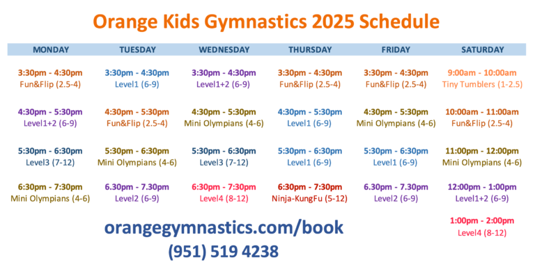 We regularly update our classes to reflect changes during holidays, seasonal breaks, and special events. Be sure to check back often or follow us on social media for updates. If a class time you’re interested in is currently full, contact us to join the waitlist. At Orange Kids Gymnastics, we’re committed to making sure your child finds the perfect time and class to grow their skills, make friends, and have fun.